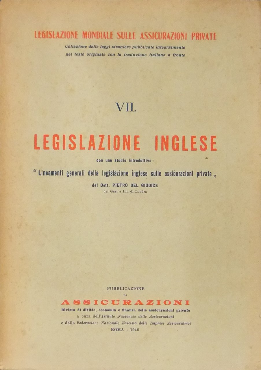 Legislazione mondiale sulle assicurazioni private Vol. VII - Legislazione inglese. Con uno studio introduttivo Lineamenti generali della legislazione inglese sulle assicurazioni private | Libri antichi e moderni | Del Giudice Pietro (A C. Di), Del Giudice Pietro