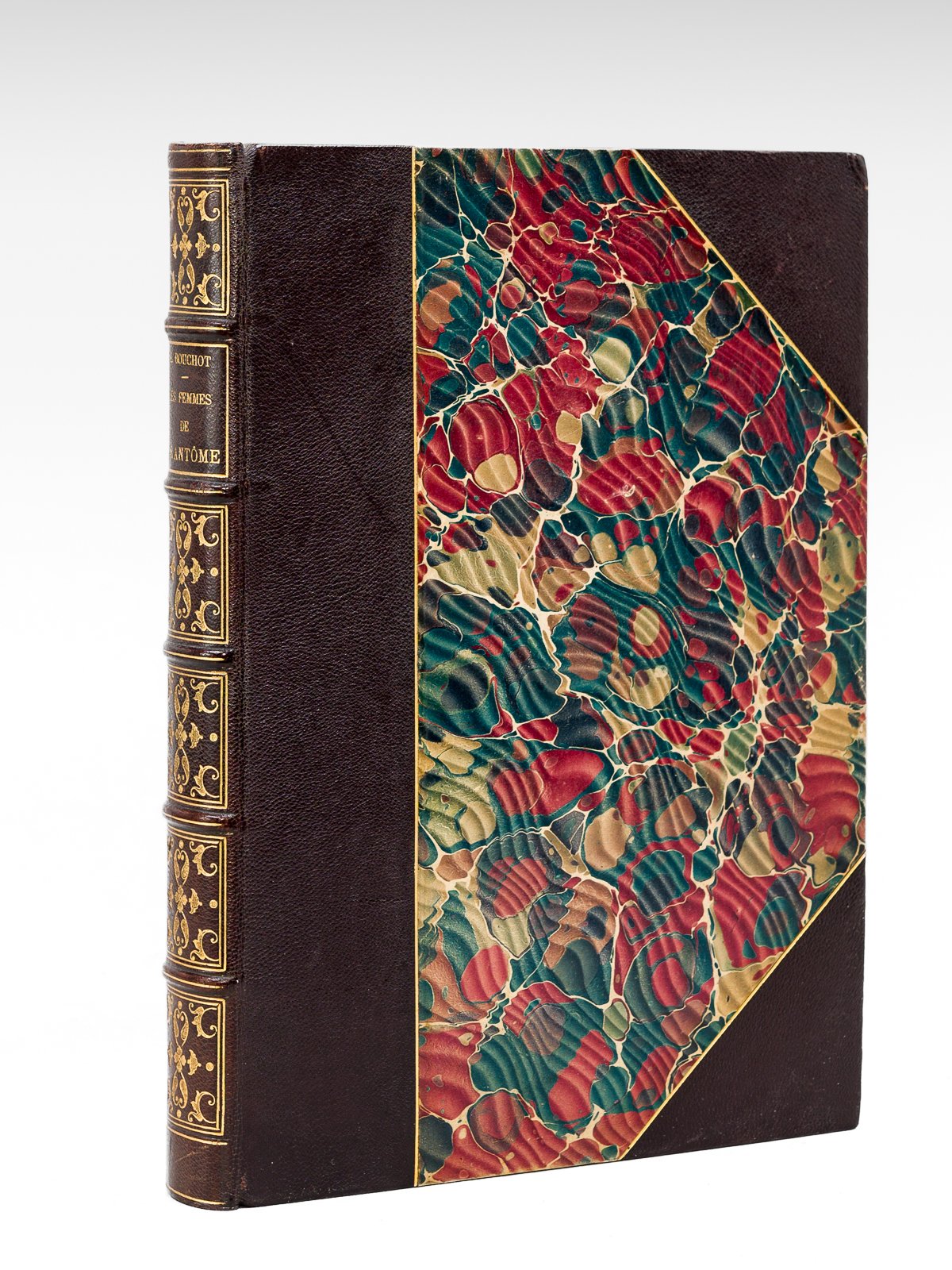 Ouvrage orné de 30 planches hors texte et de nombreuses gravures dans le texte, reproduites d'après les originaux, 1 vol. in-4 reliure de l'époque plein chagrin maroquiné à coinsbrun, dos à 5 nerfs dorés richement orné, tête dorée, couvertures et dos conservés, filet doré en mors et coins, reliure signée de Durvand, Maison Quantin, Compagnie Générale d'Impression et d'Edition, Paris, 1890, 290 pp. et 1 f. n. ch. avec pl. hors texte Historien et directeur du Cabinet des Estampes de la Bibliothèque Nationale, Henri Bouchot (1849-1906) nous propose ici une luxueuse et remarquable introduction à ce monde complexe, violent et passionné de la seconde partie du seizième siècle, décrit par Pierre de Bourdeille, seigneur de Brantôme dans ses "Vies des Dames galantes". Bel exemplaire dans une très belle reliure signée de Durvand (ex-libris Robert et Roland Thibaut).