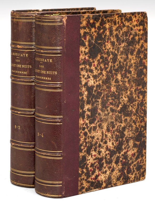 2 vol. in-8 reliure de l'époque demi-chagrin noir, dos à 4 nerfs dorés, E. Dentu, Paris, 1875, 2 ff., 399 pp., 2 ff., 383 pp. avec deux portraits en frontispice ; 2 ff., 383 pp., 2 ff., 382 pp. et 1 f. avec deux portraits en frontispice Introduit au coeur de la vie littéraire parisienne de 1843 (où il devient directeur de la Revue l'Artiste) à 1885 (où il est encore président de la Société des Gens de Lettres), Arsène Houssaye (1814-1896) était un remarquable connaisseur de la vie parisienne et notamment de ses nuits parisiennes, dont il donne ici sous une forme romancée de nombreux aperçus piquants. Charles Baudelaire lui dédiera les poèmes en prose du "Spleen de Paris". Bon état (un signet coupé, anciennes restaurations intérieures à qq. coins, qq. rouss.). Vicaire, IV, 203
