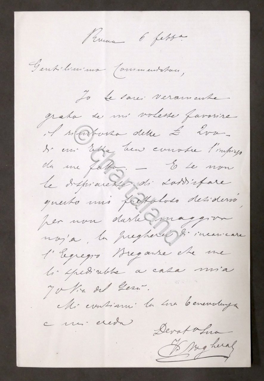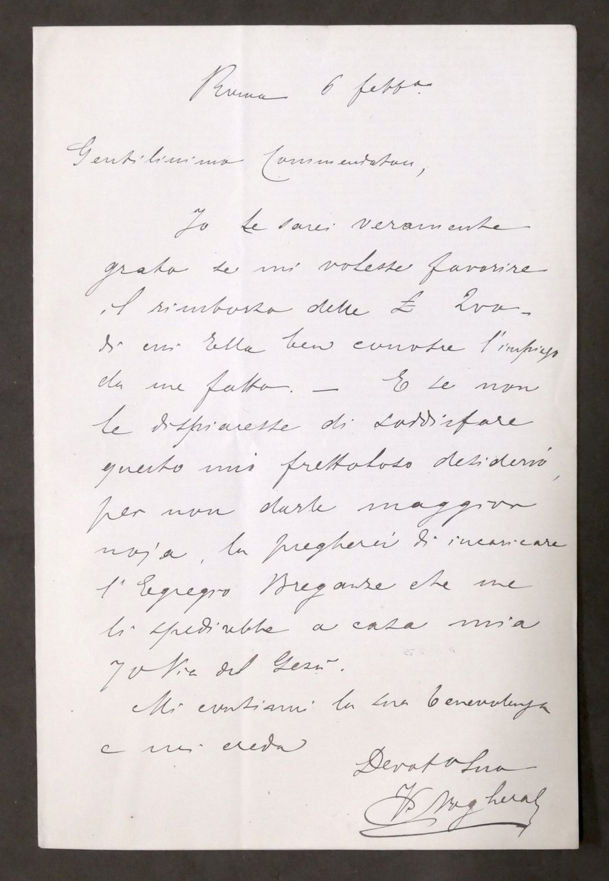 Lettera con autografo del deputato Venceslao Noghera - 1875 ca. Una pagina manoscritta di quattro - Lingua italiana. Dimensioni: 13 x 21 cm ca. Condizioni molto buone.