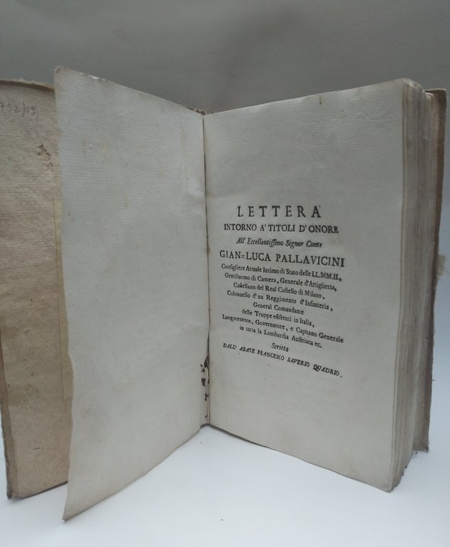 Lettera intorno a' titoli d'onore. All'Eccellentissimo Signor Conte Gian Luca Pallavicini . | Libri antichi e moderni | Quadrio Francesco Saverio