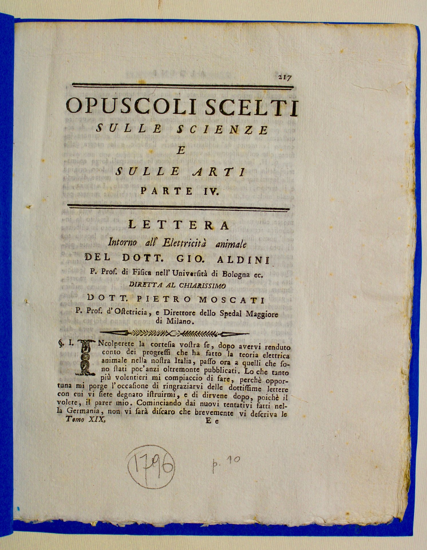 8° (230x185); pagine 217-226. Cartoncino moderno azzurro. Interessante lettera riguardante la celebre disputa Volta-Galvani in cui Aldini si schiera dalla parte di Galvani. Estratto da "Opuscoli scelti sulle scienze e sulle arti" continuazione ideale della "Scelta di opuscoli interessanti", importantissima e rara raccolta di saggi scientifici compilata dal 1774 al 1777 e successivamente ristampata nel 1784. La raccolta contiene saggi e memorie dei più grandi scienziati dell'epoca fra cui spiccano Volta, Lavoisier, Landriani, De Saussure, Spalanzani, Ferguson, Franklin, Beccaria, Priestley. Ben conservato, intonso con barbe, seppur in modesta legatura.
