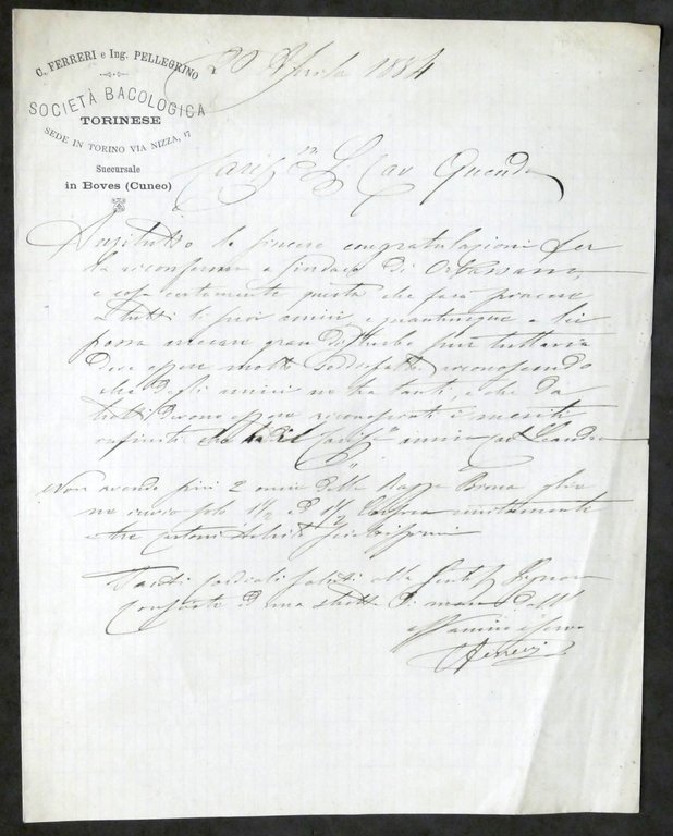 Lettera manoscritta - Società Bacologica Torinese - 1884 | Libri antichi e moderni |