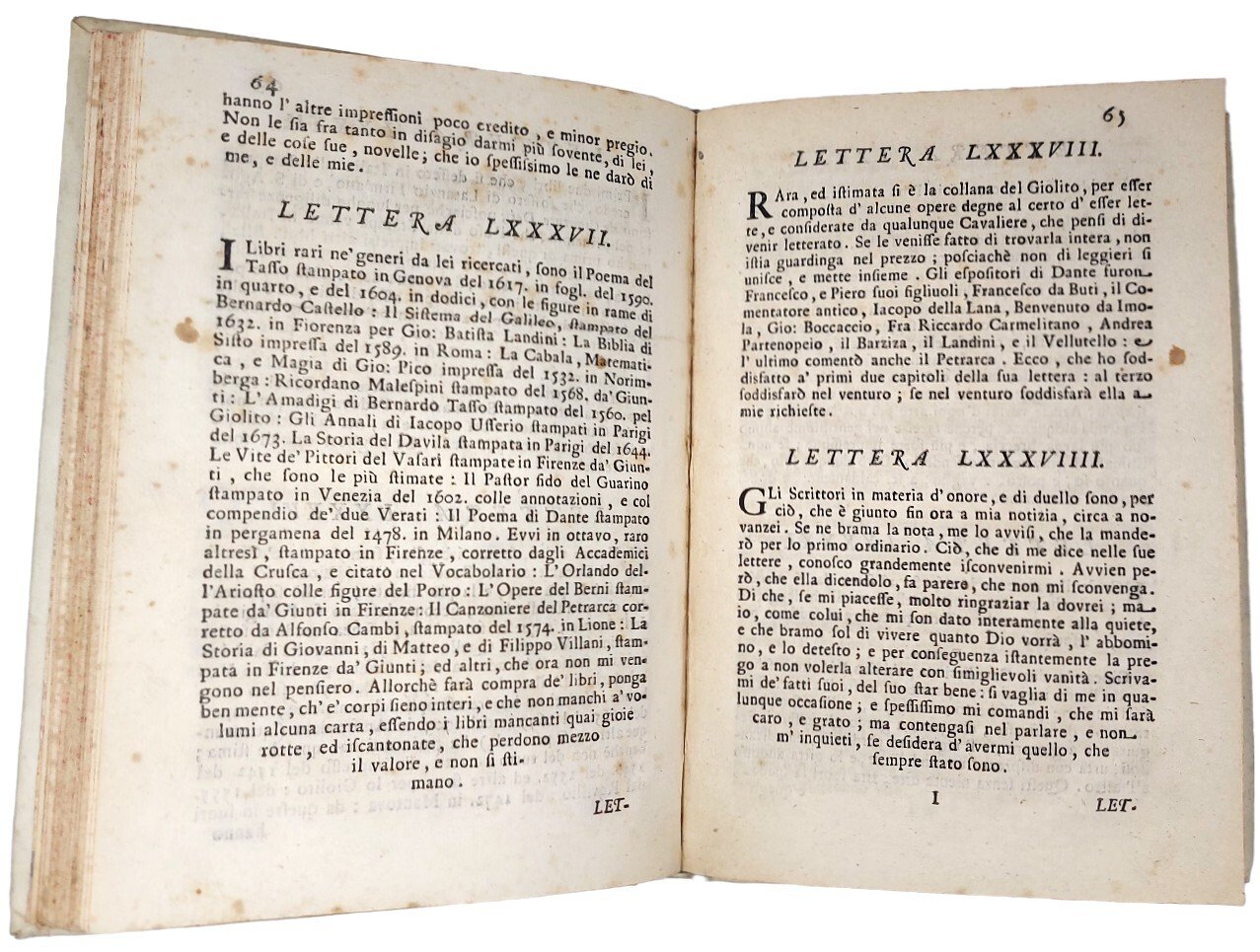 >in-4 piccolo (190x135 mm), pp. VIII, 76, 84 ultimo f. bianco), vignetta con monogramma al titolo, ripetuto sulle due diverse testatine (pp. π3r, A1r), iniziali e finalini ornati. Legatura settecentesca in p. pergamena, piatti ornati a secco,titolo in oro su tassello al dorso, tagli spruzzati di rosso. Per il nome dell'A., Leone (o Lione) Pascoli si veda Melzi. Prima ed unica edizione della prima parte (unica pubblicata delle tre annunciate dall'autore), ed opera prima dell'economista e scrittore perugino, stampata anonima e sotto gli auspici dell'Accademia Fiorentina. Si tratta di 100 lettere, brevi e scorrevoli, su numerosi e vari argomenti di erudizione, che spaziano dalla filosofia alla geometria, dalla letteratura ai viaggi, senza trascurare i riferimenti all'arte. Curiosa la lettera in cui si esamina il caso di un duello cavalleresco per difendere l'onore offeso di ingiuria. Da notare anche la presenza di diverse lettere di argomento bibliografico: le num. 88 e 97 sono dedicate alle collane Gioia e Anello di Giolito de Ferrari, la n. 87 parla della rarità dei libri, citando diverse edizioni di pregio; la n. 86 tratta del Decamerone dei Giunti e le sue varie edizioni a partire dalla Ventisettana, che l'A. afferma "fu in mia presenza venduta sedici zecchini in Venezia"; la n. 85 cita i primi due libri impressi in Italia e tratta della longevità delle imprese editoriale (Aldo, I Giunti, Torrentino ecc.). Bell'esemplare di opera rara, qualche macchietta di inchiostro, un paio di pagine brunite e lievi fioriture ai margini di pochi fogli. Melzi, Dizionario di opere anonime e pseudonime, 2, p. 116
