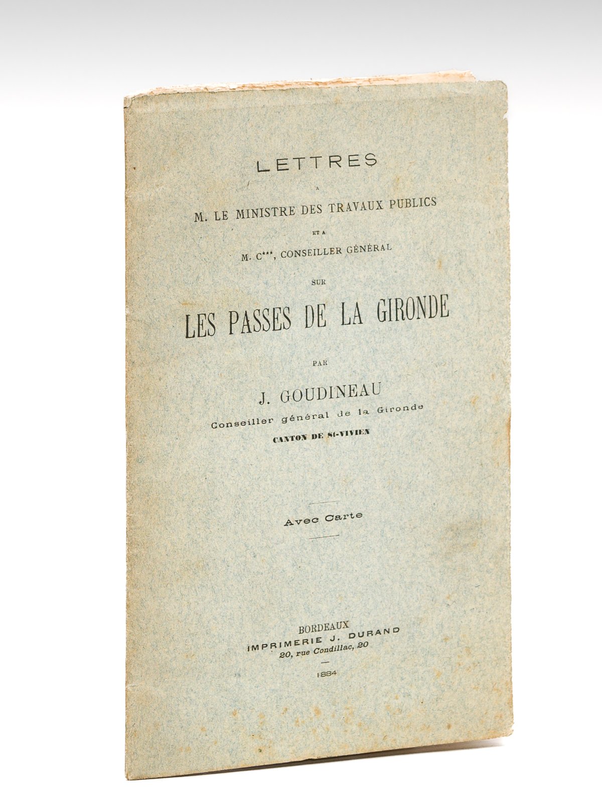 Par J. Goudineau, Conseiller Général de la Gironde, canton de St-Vivien, avec carte, 1 brochure in-8, Imprimerie J. Durand, Bordeaux, 1894, 22 pp. avec une carte dépliante : "Carte de l'Embouchure de la Gironde d'après l'Atlas des cartes dressées par Mr. Manen Ingénieur-Hydrographe". Très intéressante brochure orné d'une étonnante carte présentant le barrage à établir entre le rocher St Nicolas et le phare de Cordouan, et les terrains qui pourraient ainsi être conquis sur l'Océan et sur le fleuve "par suite de la suppression de la passe sud". Bon état (qq. rouss., très bon état par ailleurs)