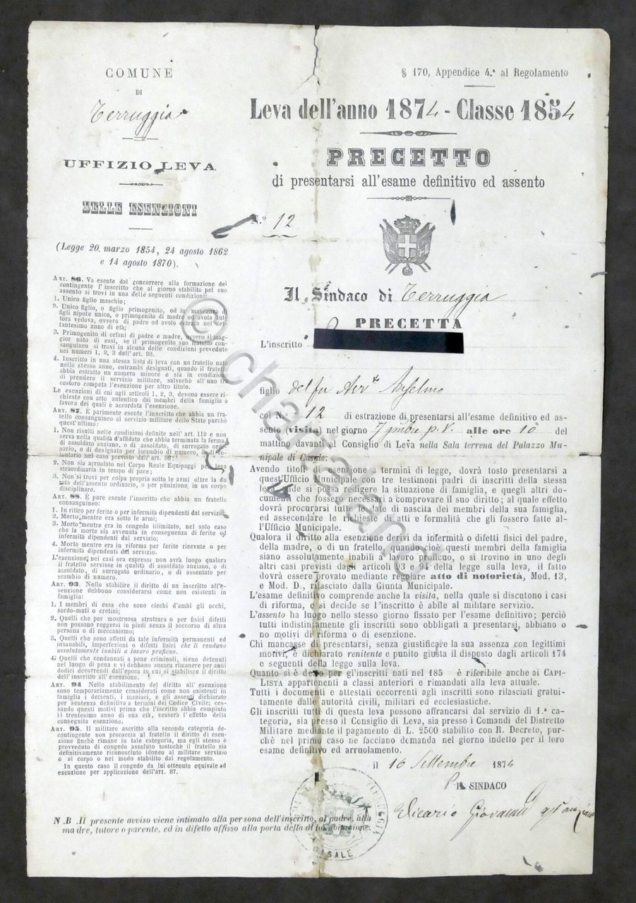 Leva dell'anno 1974 - Classe 1854 - Precetto di visita militare - Terruggia (AL)