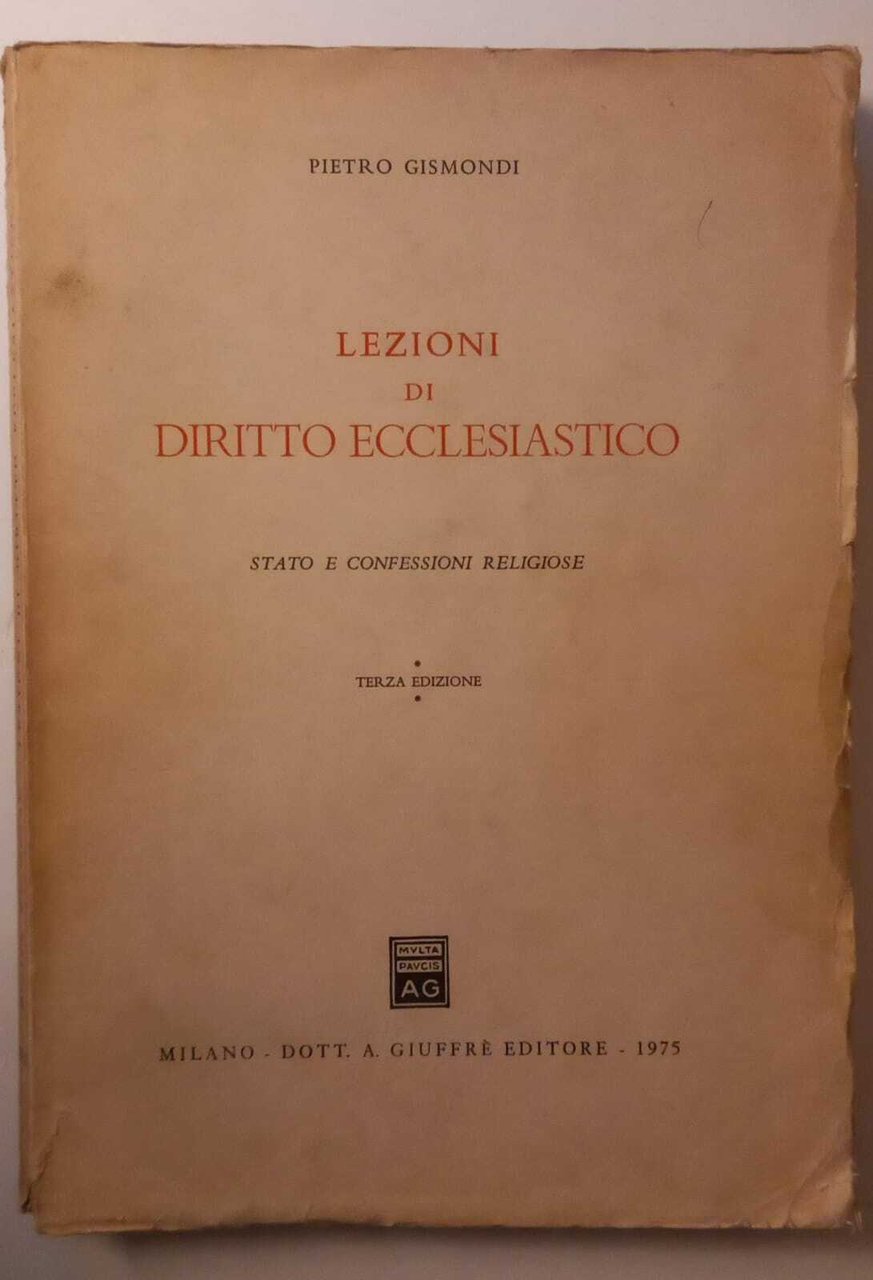 Lezioni di Diritto ecclesiastico. Stato e Confessioni Religiose. La brossura editoriale del volume riporta usuali tracce del tempo, piccoli tagli al dorso e ai bordi, all'interno sporadiche sottolineature a lapis, ma in buono stato. 325 Buono (Good) .