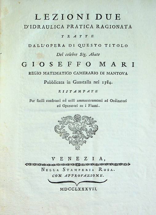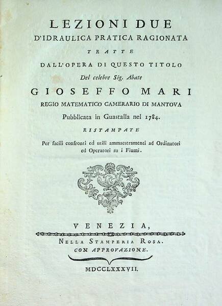 Lezioni due d'idraulica pratica ragionata tratte dall'opera di questo titolo del celebre sig. abate Gioseffo Mari . pubblicata in Guastalla nel 1784. Ristampate per facili confronti ed utili ammaestramenti ad ordinatori ed operatori su i fiumi.