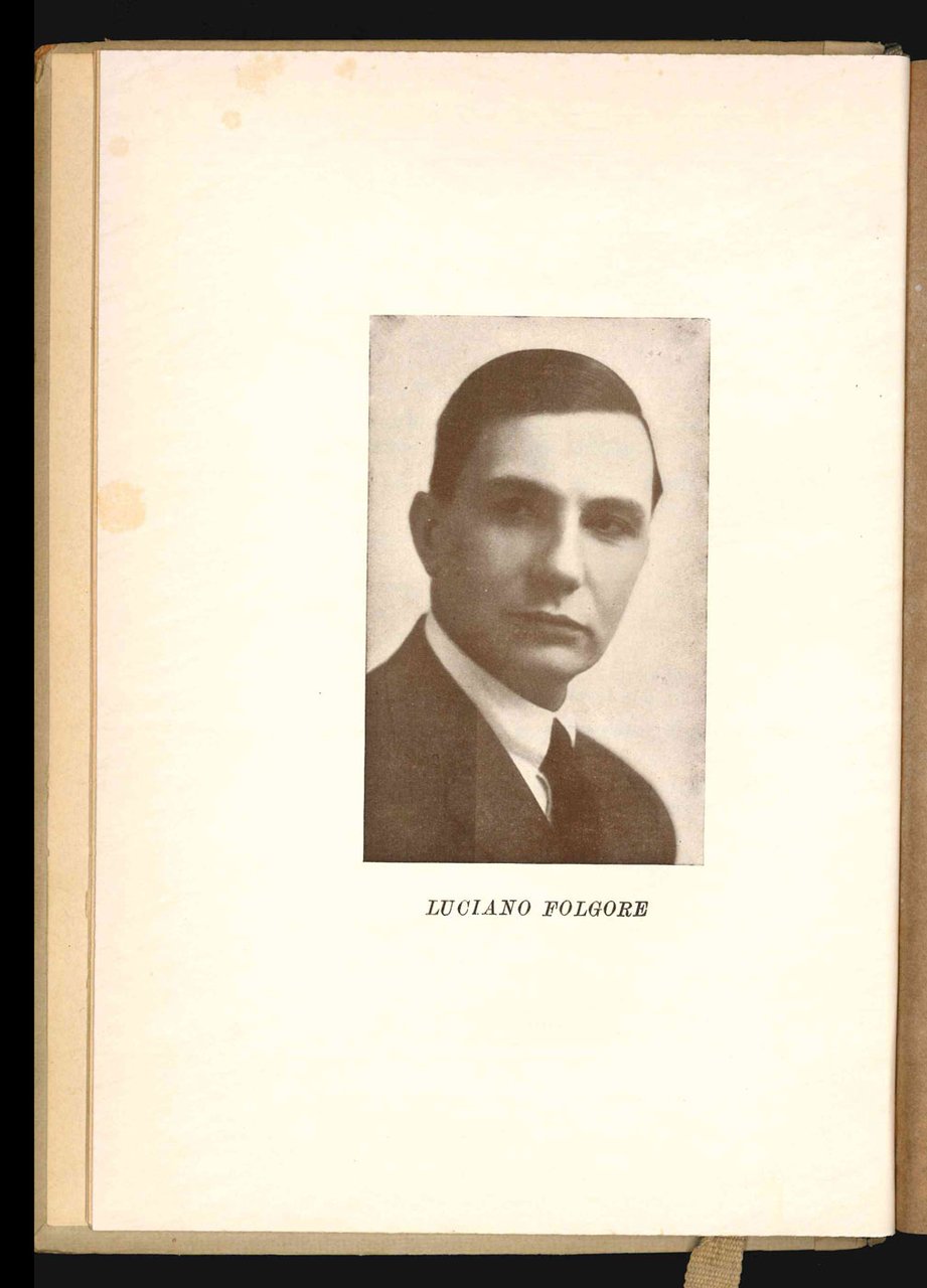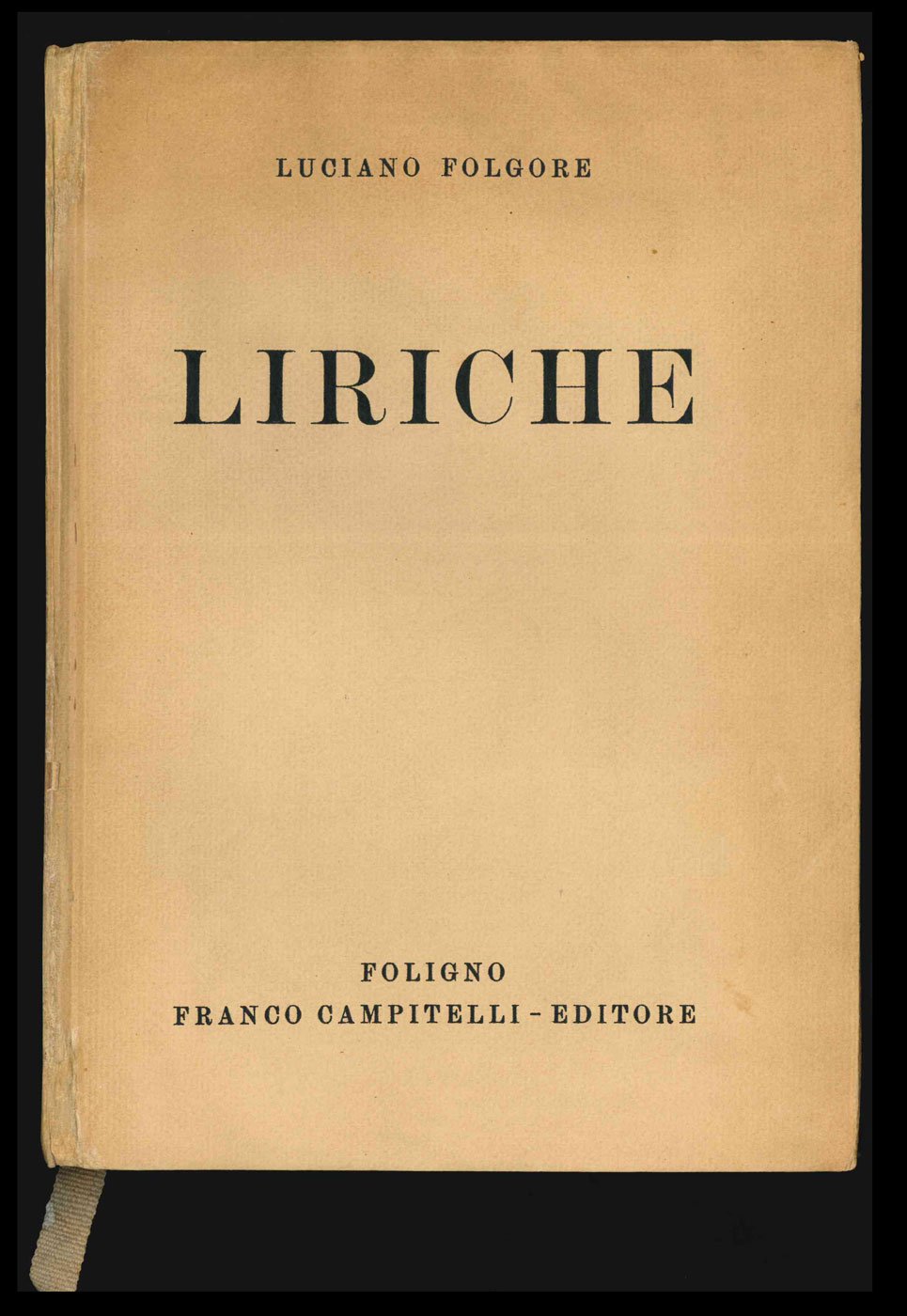LIBROPrima edizione nella tiratura di testa.Esemplare n. 61 di una tiratura non specificata, con il cartonato di color beige (esiste anche di color grigio chiaro); lievi restauri alle cerniere del cartonato, velina protettiva del ritratto brunita, come usuale, per il resto in ottime condizioni, fresco e pulito.Delle «Liriche» di Folgore pubblicate da Campitelli nel 1930 fu fatta una tiratura numerata su carta di pregio rilegata in cartonato (presente esemplare), oltre a una tiratura comune in brossura su carta normale. -- Raccolta di circa trenta componimenti impaginati in maniera elegante in formato grande, dedicata alla moglie Carla Giannarelli, sposata nel 1910 e prematuramente scomparsa nel 1922: «Alla memoria di Carla Folgore | che dà a questi canti | la luce e l’amore | della sua primavera immortale».Cfr. Cammarota, Futurismo, 208.7 (con imprecisioni)