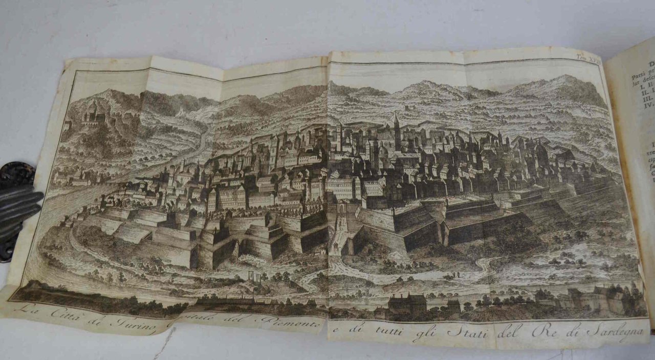 Cm. 17,5, pp. (40) 461 + (3) di registro e di imprimatur. Legatura coeva in piena pergamena rigida con titolo in oro al dorso. Antiporta allegorica e 28 tavole calcografiche ripiegate f.t.: carta geografica generale dell'Italia, carta del Ducato di Savoia, carta del Piemonte, veduta a volo d'uccello di Torino e vedute particolari della stessa città, la Sindone, Cuneo, Mondovì, Susa, Vercelli, Nizza, Casale, Genova, Lerici, ecc. Solo la carta dell'Italia con antichi rinforzi al dorso, poeraltro esemplare genuino ed in buono stato di conservazione. Prima edizione italiana del volume dedicato alla Savoia, al Piemonte, alla Valle d'Aosta e alla Liguria della celebre e poderosa opera del Salmon. L'opera, scritta originariamente in inglese, pubblicata tra il 1737 e il 1766 e presto tradotta nelle principali lingue europee, tra cui l'italiana in ben 26 volumi. Cfr. Morazzoni, p. 253.
