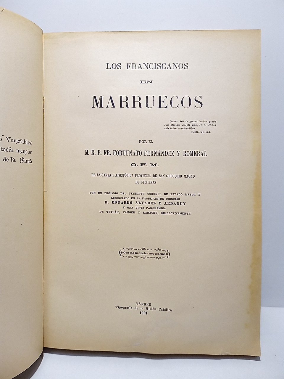 Los Franciscanos en Marruecos / Por. O. F. M. de la Santa y Apostólica Provincia de San Gregorio Magno de Filipinas; con un prólogo del Tnte. Coronel de Estado Mayor.D. Eduardo Alvarez y Ardanuy y una vista panorámica de Ttuán, Tánger y Larache | Libri antichi e moderni | Fernandez Y Romeral, Fr. Fortunato