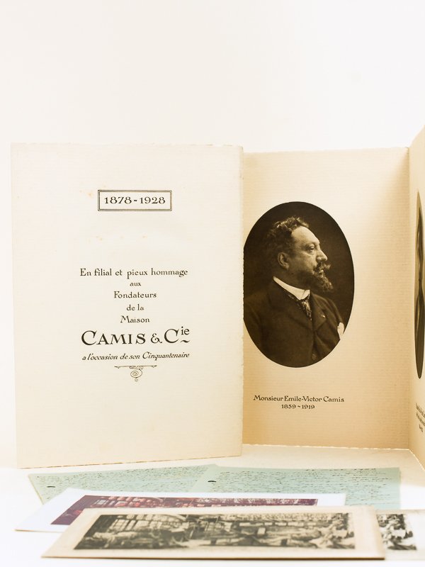Carte d'hommage format in-8 1878-1928. En filial et pieux hommage aux Fondateurs de la maison Camis & Cie à l'occasion de son Cinquantenaire [ en 2 exemplaires ] [ Avec : ] 2 L.A.S. de Robert Camis, du 26 août et 2 septembre 1940 destinées à l'imprimeur bordelais Le Nué ; on joint avec 3 cartes publicitaires Intéressant petit lot de documents, dont 2 émouvantes L.A.S. de Robert Camis, dans laquelle il invite notamment son correspondant bordelais à contacter les maisons bordelaises d'importance (Marcelin Marceau, Calvet, Schröder Schyler, Marie Brizard, etc.) pour leur proposer tous travaux courants, dont les étiquettes. Prix du lot.