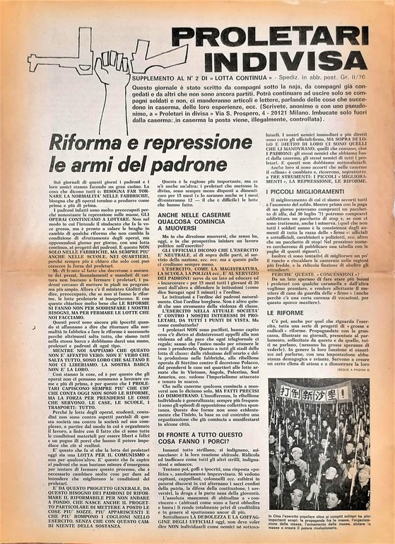 Dobbiamo lottare dovunque ci troviamo: si lotta nelle fabbriche, si lotta nelle scuole, si lotta nelle caserme, si lotta nelle carceri. Bisognava estendere il conflitto, e Lotta Continua promuove la mobilitazione anche all'interno delle Forze Armate tramite i PID, Proletari In Divisa che pubblicavano la rivista omonima. Organizzarsi politicamente e sindacalmente nelle caserme era vietato dal codice militare, motivo per cui le iniziative e la diffusione della rivista avevano carattere clandestino.