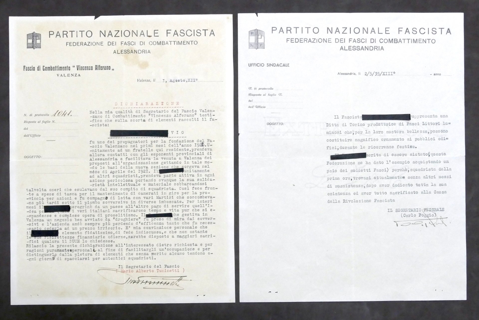 Lotto 2 Autografi Segretari Fasci Combattimento Alessandria / Valenza 1934 1935