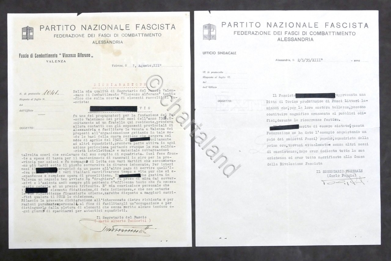 Partito Nazionale Fascista Lotto 2 lettere di raccomandazione su carta intestata Fasci di Combattimento di Alessandria / Valenza con firme dei segretari. Dimensioni: 22 x 29 cm ca. Condizioni molto buone.