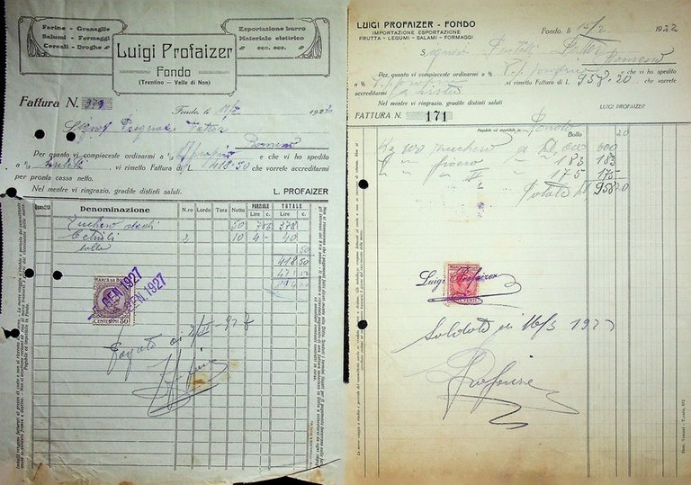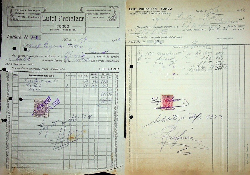 Lotto di 2 fogli di formato 28x21 cm. Condizioni : USATO - Stato : Buono, ordinari segni d'uso e del tempo. Altre note : IL PREZZO SI RIFERISCE AL LOTTO DELLE 2 FATTURE tutte indirizzate all'emporio dei fratelli Fattor di Romeno, una del 1922 e una del 1927.