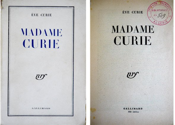 Paris, Gallimard, 1945. 4to.; 311 pp., 2 hs. y una lámina con un retrato de Madame Curie. Cubiertas originales.Lomera con faltas.