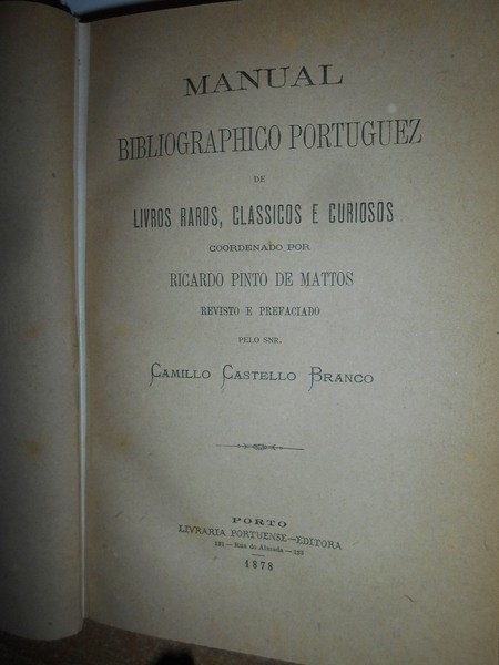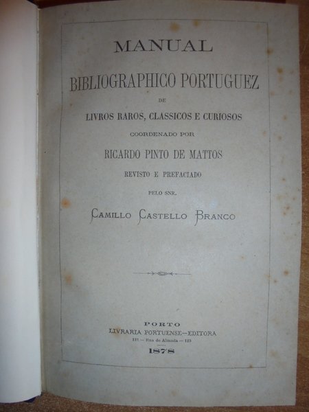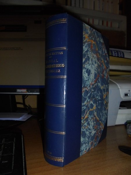 Ricardo Pinto De Mattos. Porto, Livraria Portuense-Editora, 1878. MANUAL Bibliographico Portuguez de Livros Raros, Classicos e Curiosos. In-8° piccolo, m. pelle con angoli, fregi e titolo in oro al dorso, copertine originali conservate. xii, 582, (1) pp. Ottimo esemplare in legatura recente con le copertine originali conservate. Uff. E - III - 3