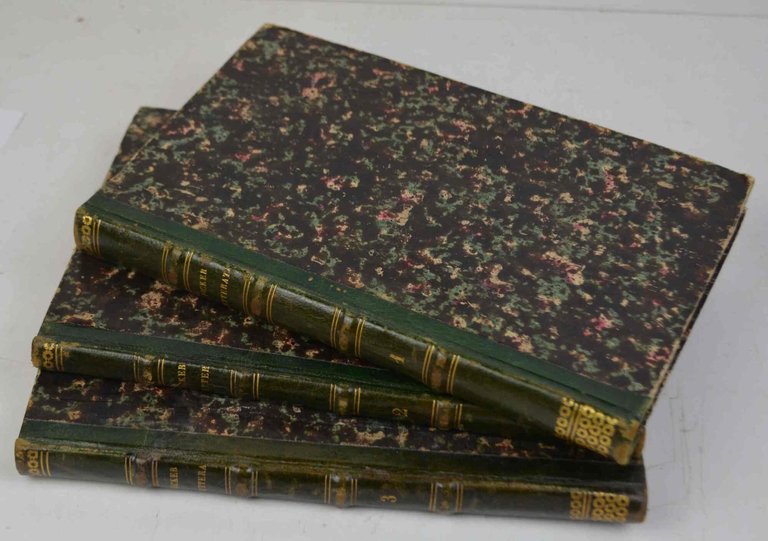Tre volumi di cm. 22,5, pp. (6) 344; 211 (1); 272. Solida ed elegante legatura coeva in mezza pelle, dorsi a nervi con titoli in oro. Ben conservato e marginoso.  Parte I: letteratura greca. Parte II letteratura romana. Parte III: appendice.