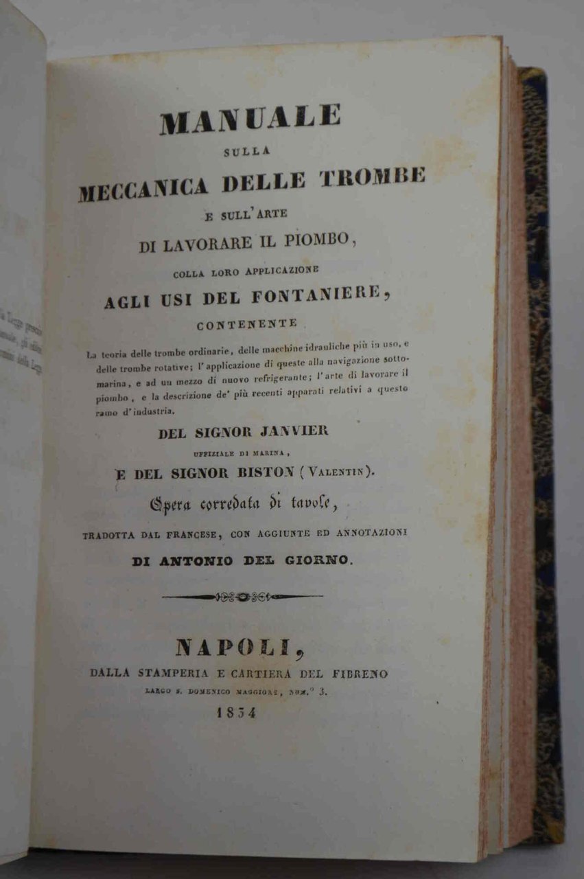 Pp. (4) 250 + (2) d'errata. Con 5 tavole incise e più volte ripiegate. Unito a: JANVIER-BISTON. Manuale sulla meccanica delle trombe e sull'arte di lavorare il piombo coll loro applicazione agli usi del fontaniere... Mapoli, Fibreno, 1834. Pp. xv (1) -322 (2). Con 3 grandi tavole incise e più volte ripiegate. Solida ed elegante legatura coeva in mezza pelle, dorso liscio con titoli in oro. Ottimo stato di conservazione.