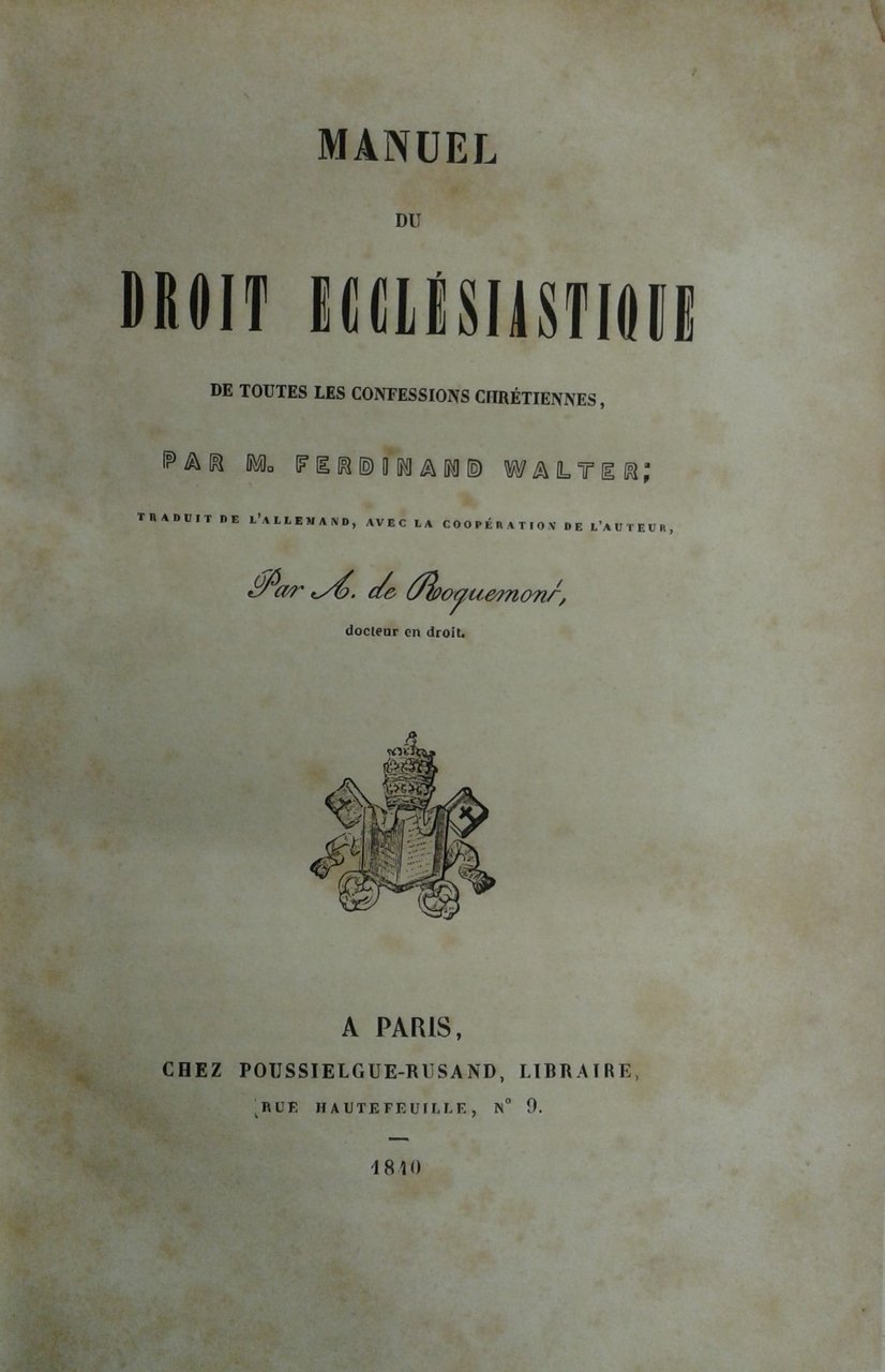 Manuel du droit ecclesiastique de toutes les confessions chretiennes . Traduit de l'allemand par A. de Roquemont | Libri antichi e moderni | Walter Ferdinand