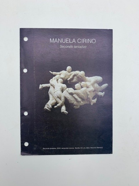 Pieghevole di 6 facciate (ciascuna misura cm 14 x 18,5) con riproduzione fotografica alla facciata anteriore della scultura "Secondo tentativo" e illustrazione alla facciata posteriore tratta dalla serie dei disegni "Nero su bianco". Fori da raccoglitore al margine interno del pieghevole. Testo in italiano e inglese ed elenco delle mostre dell'artista. Pieghevole della mostra di opere di Manuela Cirino svoltasi alla Galleria Ciocca di Milano nel settembre-novembre 2000. Sull'artista cfr. Ciavoliello, "Dagli anni 80 in poi. Il mondo dell'arte contemporanea in Italia", p. 39.