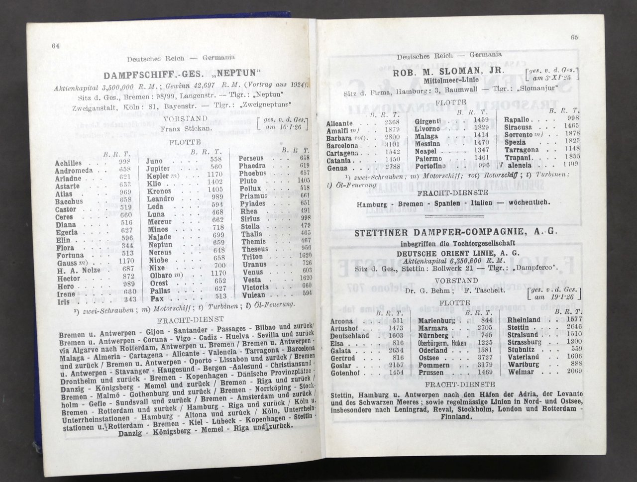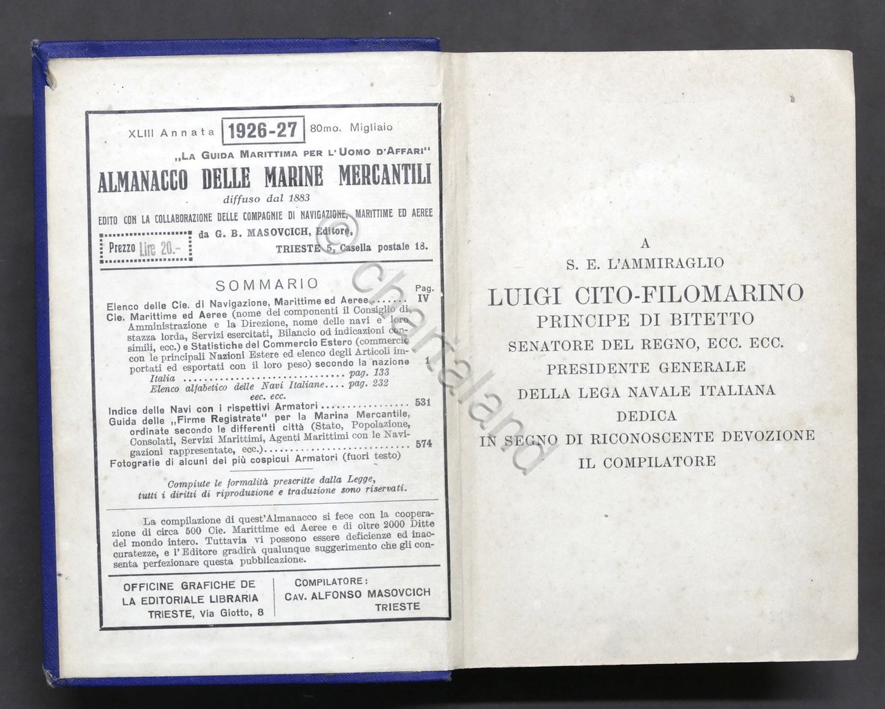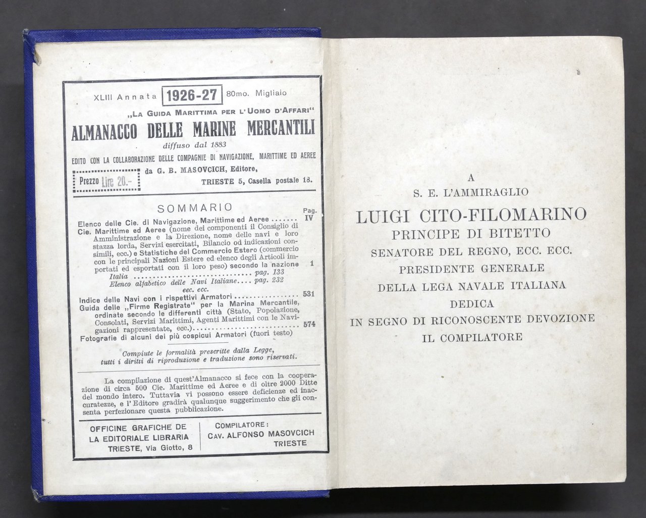 Marina Almanacco delle Marine Mercantili - Annata 1926 / 1927 Pag. XLII, 789; con alcuni ritratti di personaggi. Copertina rigida in tela editoriale - Testo in varie lingue. Dimensioni: 9 x 14 x 4 cm ca. Condizioni molto buone.