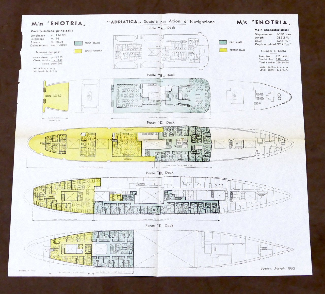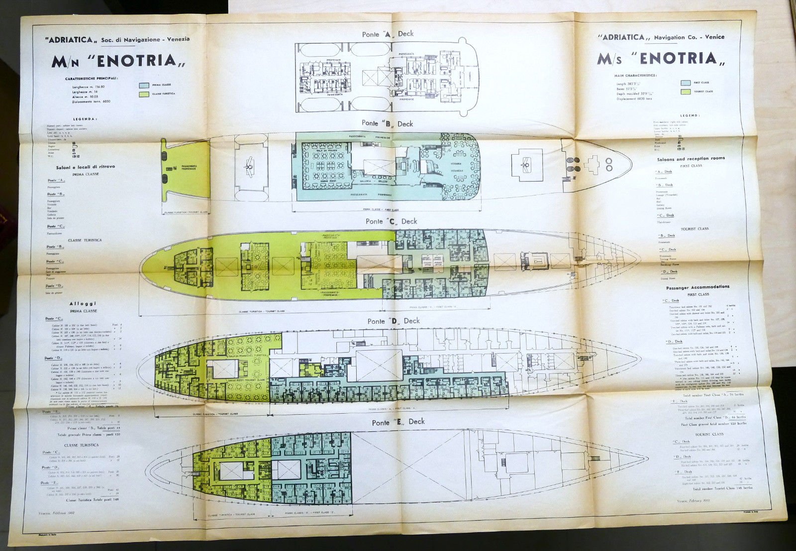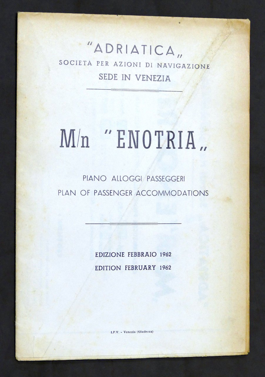 *** Marina - Piano alloggio passeggeri M/n Enotria - Società per Azioni di Navigazione Adriatica - Sede in Venezia - 1962 - Foglio ripiegato più volte di dimensioni: 70 x 100 cm ca. Allegata velina con piani dei ponti e caratteristiche della nave (33 x 35 cm ca.) Per appassionati, studiosi e collezionisti