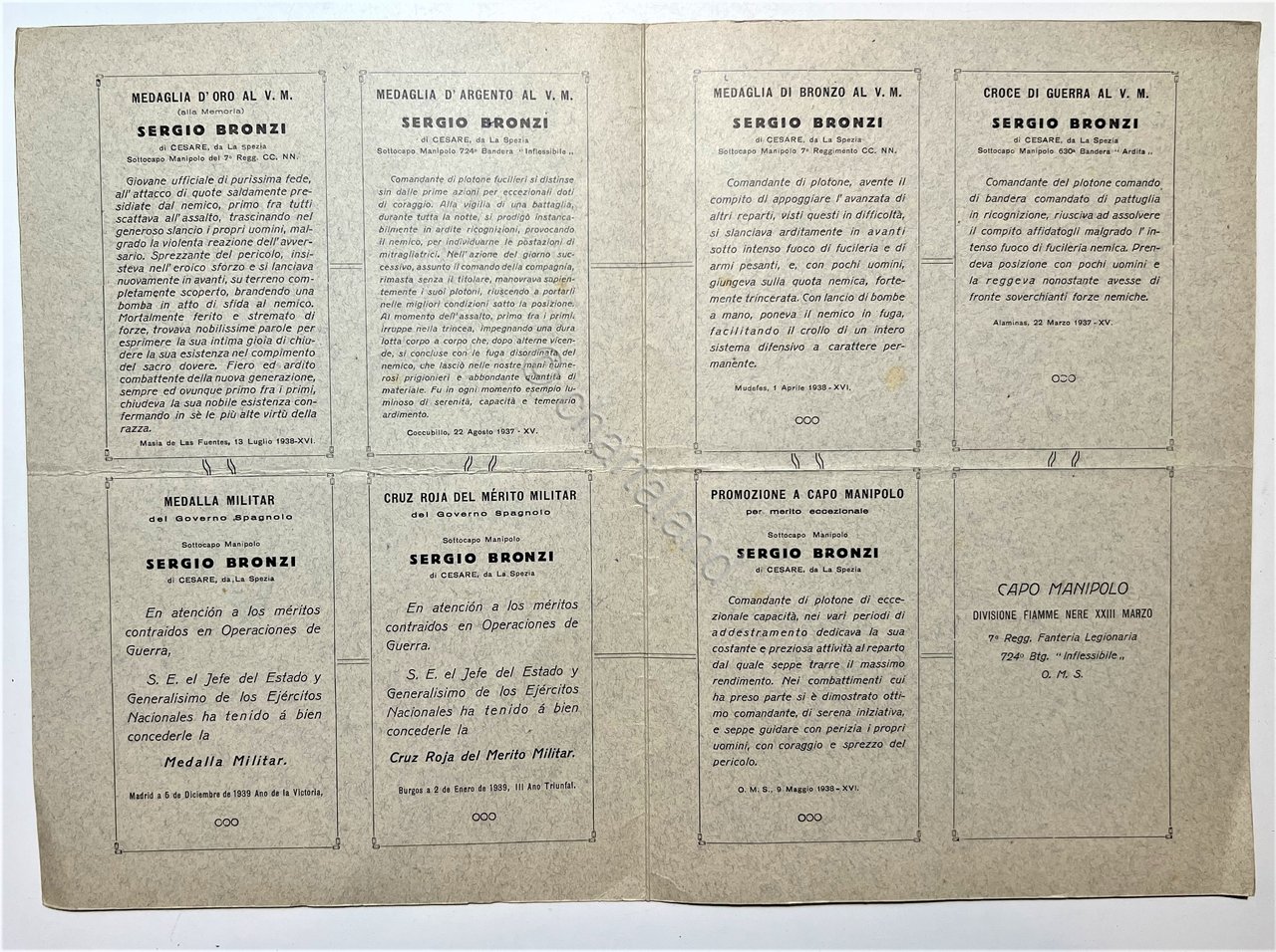 Medaglia d'Oro - Sergio Bronzi - 1912 - 1938 Pluridecorato. Testo in lingua italiana. Pagine 4 Copertina morbida. Condizioni molto buone.