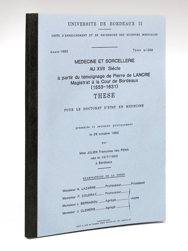 Médecine et Sorcellerie au XVIIe siècle à partir du témoignage de Pierre de Lancre Magistrat à la Cour de Bordeaux (1553-1631). Thèse pour le Doctorat d'Etat en Médecine présentée et soutenue publiquement le 28 octobre 1983