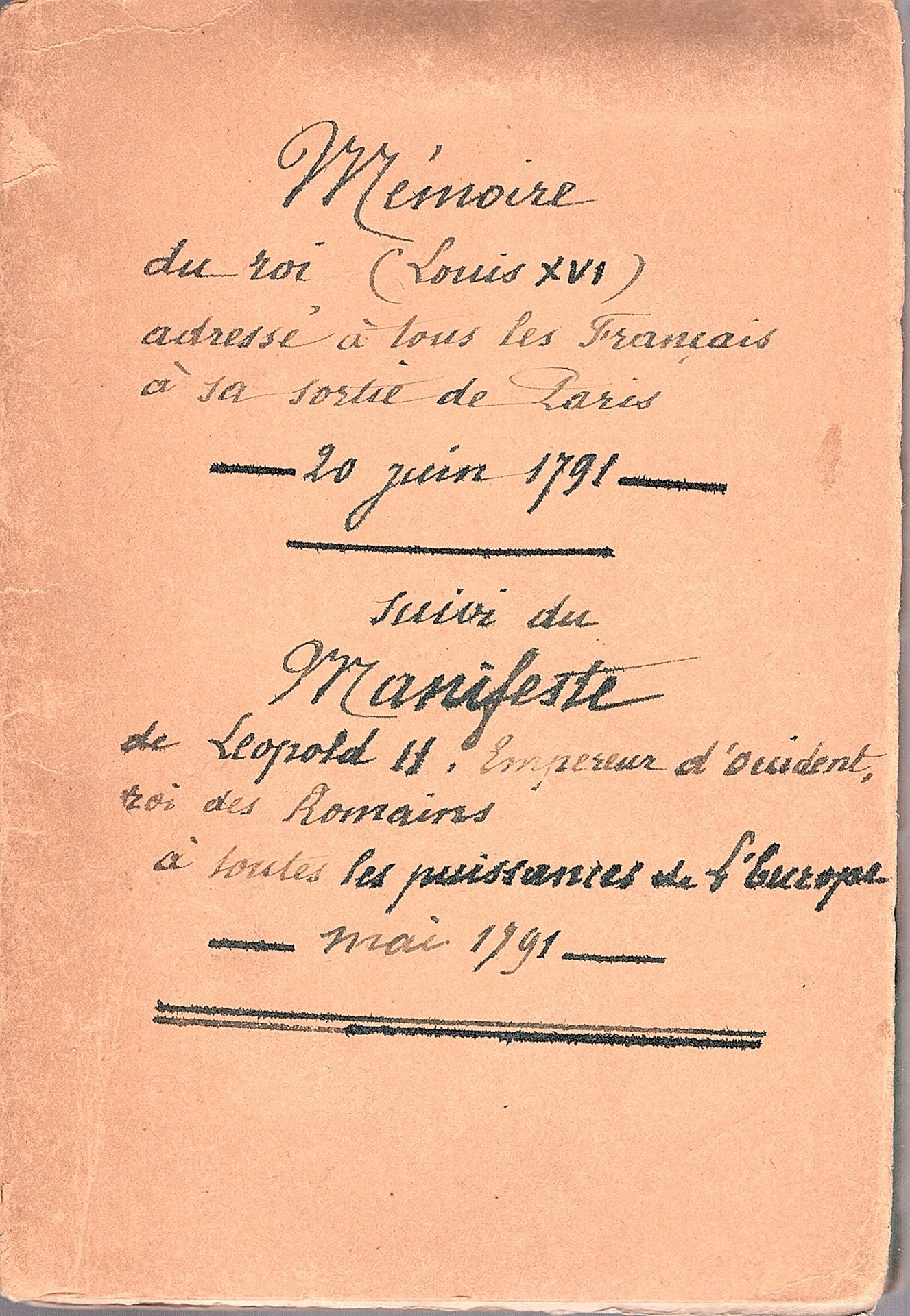 2 opere in un fascicolo in-8° in brossura posticcia con titolo calligrafato al piatto. Discreto esemplare. Comprende: 1) Mémoire du Roi, adressé à tous les François, à sa sortie de Paris, cit., pp. 28. Edizione originale, molto rara. La memoria non è di certa attribuzione a Luigi XVI; fra gli altri, Louis Blanc, nella sua 'Storia della Rivoluzione Francese', la ritenne invece composta dal fratello minore del sovrano, 'Monsieur', Louis Stanislas Xavier de France, Conte di Provenza (17551824), il futuro Luigi XVIII. Una sola copia in SBN / ICCU, alla Biblioteca comunale Classense di Ravenna. 2) Manifeste de Léopold II, Empereur d'Occident, Roi des Romais, a toutes les puissances de l'Europe. A Paris, de l'Imprimerie Royale, Mai, 1791, pp. 23. Edizione originale e unica, assai rara, di quest'operetta (ritenuta da taluni apocrifa) impressa sotto il falso nome di Leopoldo II del Sacro Romano Impero (Vienna, 1747-ivi, 1792), contenente la dichiarazione di guerra dell'Austria alla Francia (l'Imperatore era fratello di Maria Antonietta). Una sola copia in SBN / ICCU, alla Biblioteca civica Giovanni Canna di Casale Monferrato. Entrambe le opere mancano al Barbier.