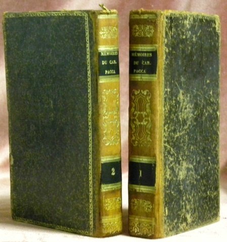 215x130mm, XII + XVI - 447 + 364 pages, avec un portrait du Cardinal Pacca en frontispice, reliure basane. Plats marbrés. Etiquettes de titre et de tomaison, caractères or. Ornementation dorée au dos et en bordure des plats. Tranches marbrées. Cachets de bibliothèque à l’intérieur, sur les pages de titres. Egalement, nom de possesseur. Plats et charnières frottés de façon sensible. Cotes de bibliothèque au dos. Intérieur des pages en très bon état, presqu’aucune rousseur.
