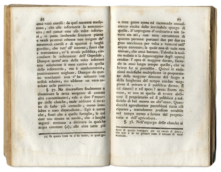 >in-12, pp. 111, con vignetta al frontespizio, testatine e finalini in xilografia. Coperta muta coeva. Edizione originale. Assai rara. Particolarmente pregevole, opera dedicata interamente alle condizioni igieniche di luoghi pubblici e privati ed al loro miglioramento, con considerazioni generali e soluzioni pratiche. Libello d'argomento assai curioso, che (a pag.93) include anche un' "Appendice intorno alla conservazione del pollame", motivata dall'osservazione che le considerazioni dell'A. sull'insalubrità di luoghi troppo affollati si applichino anche alle pratiche d'allevamento.  Buon esemplare, fresco e marginoso (minima, quasi impercettibile, gora d'umido al margine inferiore).