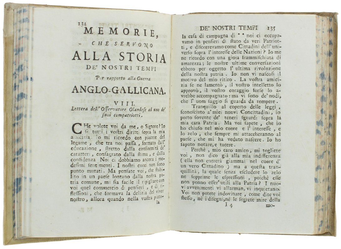 (Codice SK/0816) In 8° antico (16 cm) 424 pp. Opera attribuita a Jacob-Nicolas Moreau, compilata da Emmerich Vattel. Titolo completo: Memorie che servono alla storia de' nostri tempi, fatte dall'osservatore olandese, compilate ed accresciute dal signor D. V. e tradotte dalla lingua francese nell'idioma italiano. Piccola incisione al frontespizio, nitida e fresca impressione su bella carta candida. Sporadiche postille marginali dell'epoca, piccolissimo tarlino marginale. Bella legatura piena pergamena rigida, tassello con titolo al dorso. Ottimo stato. ~~~ SPEDIZIONE IN ITALIA SEMPRE TRACCIATA