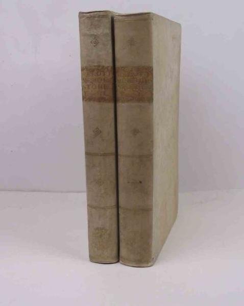 Due volumi di cm. 28, pp. 423 (1); 387 (1). Con una bella tavola fuori testo incisa in rame al primo volume, Solida ed elegante legatura coeva in piena pergamena rigida, dorsi lisci con titoli e filetti in oro. Tagli colorati. Esemplare marginoso, particolarmente fresco ed in eccellente stato di conservazione. Celebre opera biografica in cui l'autore traccia i profili biografici dei maggiori esponenti della cultura ferrarese. Nel 1811 apparirà un supplemento.