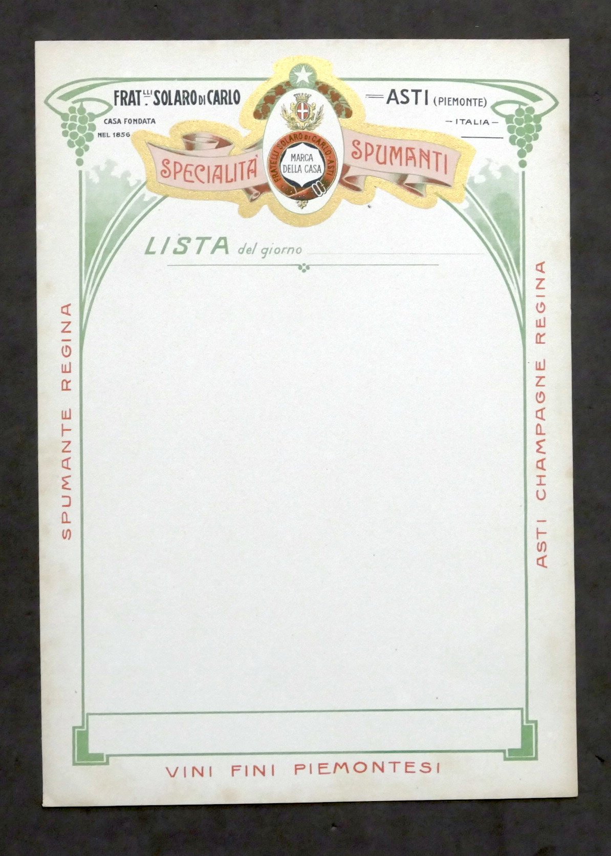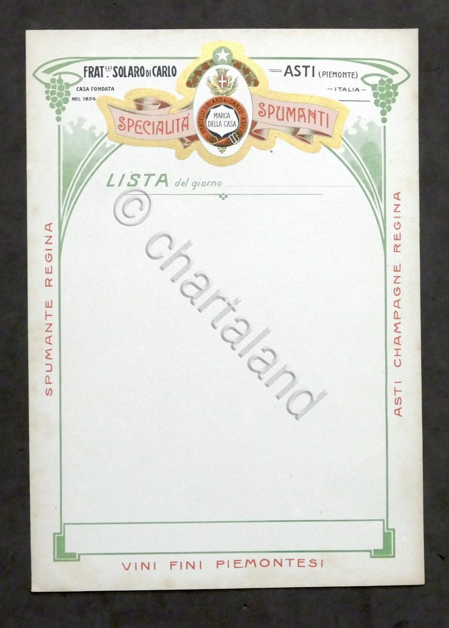 Menu - F.lli Solaro di Carlo - Asti - Vini e spumanti - inizio '900 Cartoncino morbido - Dimensioni: 17 x 24,5 Condizioni molto buone.