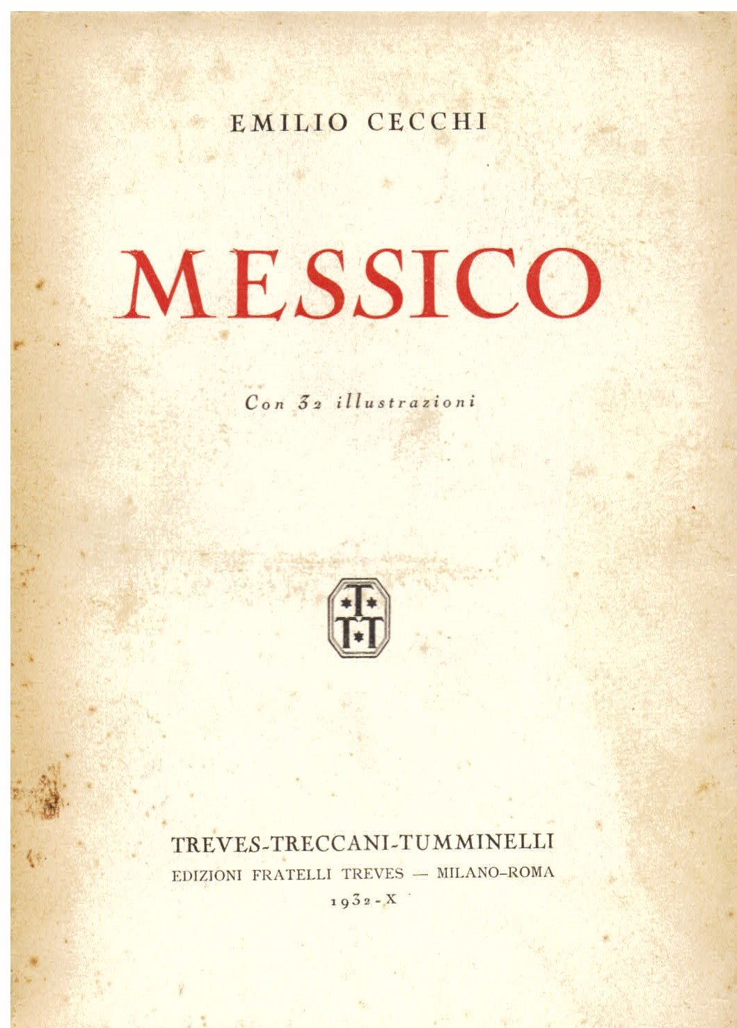 In-8°, pp. (4), 156, brossura editoriale. 32 tavv. fotografiche f.t. Ottimo stato. Prima edizione di questo celebre resoconto cecchiano di viaggi in Messico, 'a rigore il più bel libro di Cecchi' (Gianfranco Contini). I primi capitoli sono dedicati agli Stati Uniti e al mondo del cinema hollywoodiano, con capitoli su Adolphe Menjou, Gloria Swanson, Buster Keaton 'che cammina sbadato, inciampando nei detriti di un mondo capovolto', Al Capone e il cinema. Spaducci, p. 84.