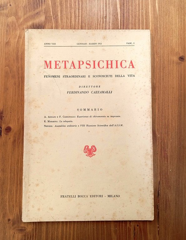 "Metapsichica. Fenomeni straordinari e sconosciuti della vita", organo della Associazione Italiana Scientifica di Metapsichica. Rivista fondata e diretta da Ferdinando Cazzamalli - Brossura editoriale, pagine numerate da 1 a 72. Fioriture alla copertina, peraltro esemplare in buone-ottime condizioni -- SOMMARIO: A. ARMANI e F. CAZZAMALLI, Esperienze di chiromanzia su impronte (con illustrazioni) - E. MARABINI, La telepatia - Notizie: Assemblea ordinaria e VIII Riunione Scientifica