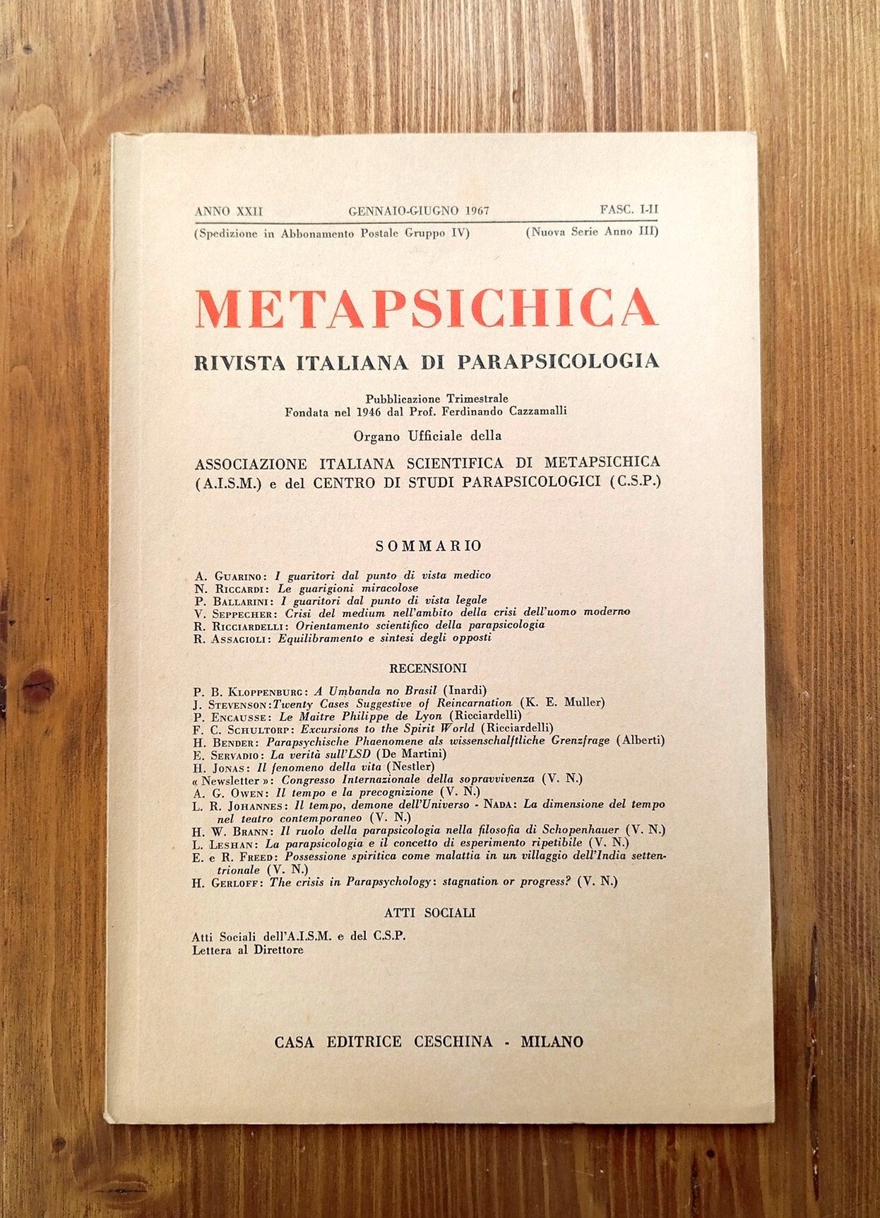 "Metapsichica. Rivista italiana di parapsicologia", organo ufficiale della Associazione Italiana Scientifica di Metapsichica e del Centro di Studi Parapsicologici. Rivista fondata e diretta da Ferdinando Cazzamalli - Brossura editoriale, pagine numerate da 1 a 68. Ottimo esemplare -- SOMMARIO: A. GUARINO: I guaritori dal punto di vista medico N. RICCARDI : Le guarigioni miracolose P. BALLARINI : I guaritori dal punto di vista legale V. SEPPECHER : Crisi del medium nell'ambito della crisi dell'uomo moderno R. RICCIARDELLI : Orientamento scientifico della parapsicologia R. ASSAGIOLI : Equilibramento e sintesi degli opposti -- Recensioni. Atti sociali. Lettera al Direttore