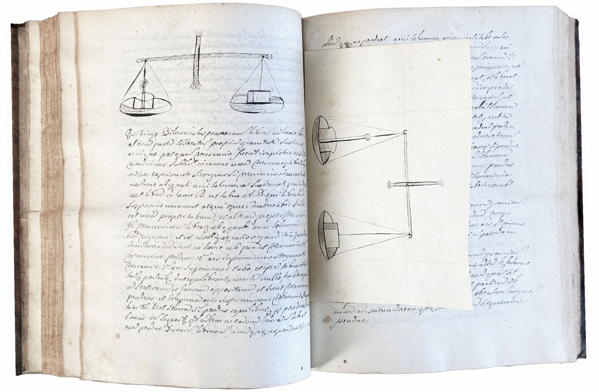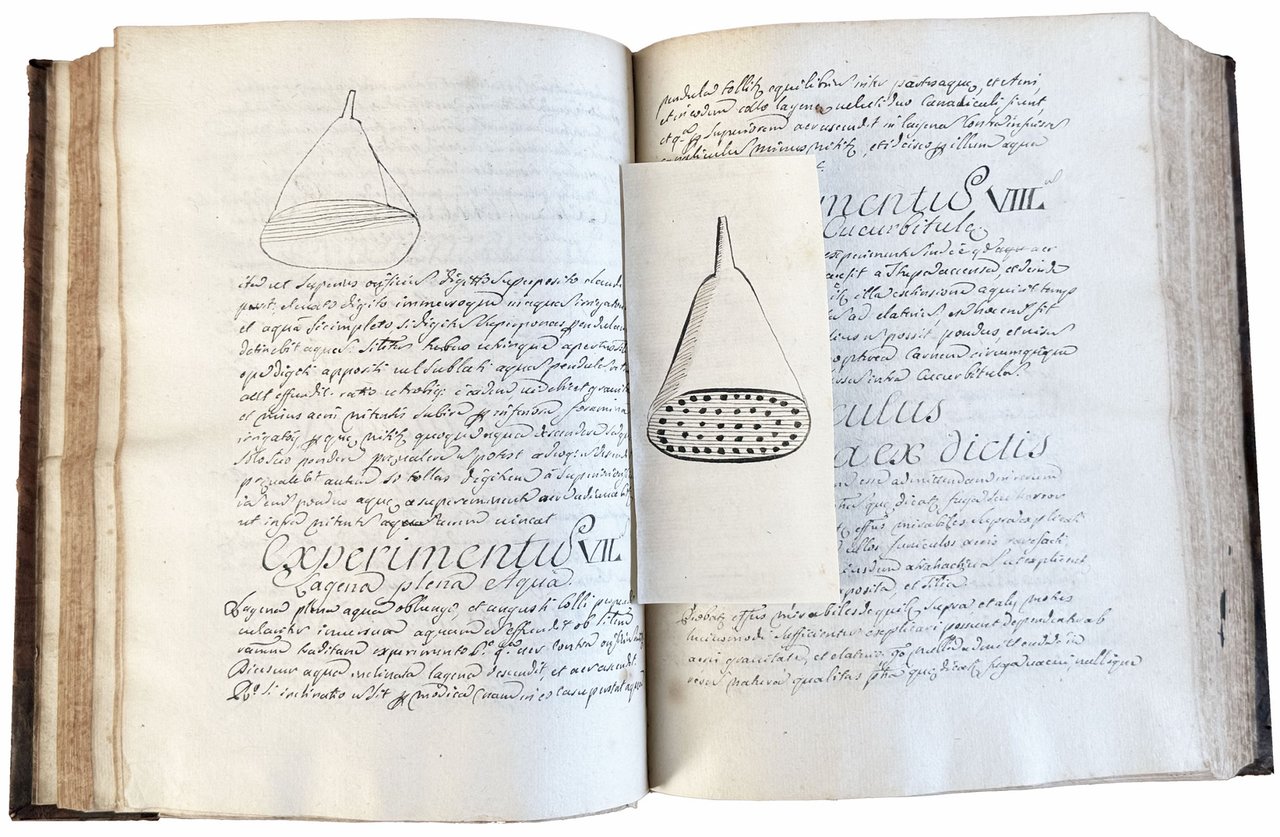 4to (223x168 mm). i + [1] leaf with a calligraphic title page, [1] leaf with the name of the author and owner of the book “Joseph Antonius Venere”, [1] engraved folding plate depicting St. Francis Xavier (1506-1552) being brought to Heaven with a printed dedication to him by the same Joseph Antonius Venere below (“S.to Francisco Xaverio Indiarum Apostolo Ioseph Antonius Venere se, suasque Theses D.D.D.”), [322] leaves including 6 blank + i. With an engraved folding plate containing 6 illustrations of scientific experiments bound between ll. [86] and [87]. Also with 2 drawings of a scale and an irrigation tool in the text and repeated in two loosely inserted leaflets placed respectively between ll. [93]/[94] and [97]/[98]. Written in an elegant and clear cursive hand with several penwork embellishments throughout. From l. [305] to the end the manuscript is written in a slightly different hand. Contemporary calf, gilt spine with five raised bands and trace of lettering piece, sprinkled edges (worn and rubbed, spine faded). Very well preserved internally.