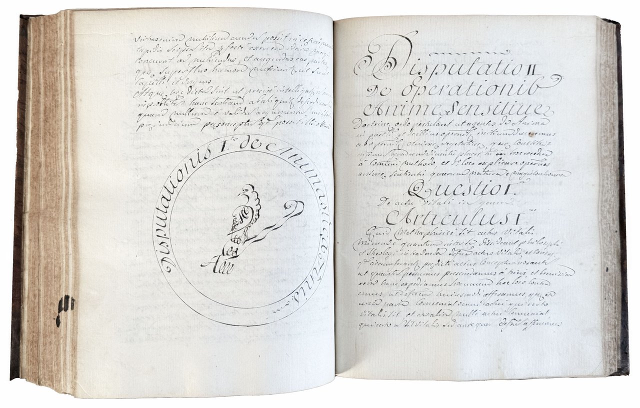 Although there is no record of a Jesuit named Giuseppe Antonio Venere, it seems plausible to assume that Venere was a pupil of the Jesuit theologian Gregorio Ghesio (1657-1700), otherswise known only for being the author of a work on the virtues of a woman from Mondovì named Cecilia Magliana, which was printed in Mondovì in 1694 (cf. De Backer-Sommervogel, III, col. 1368). The present manuscript, divided into two parts (De Methaphysica and De anima), appears in fact to contain the Aristotelian-Thomistic theses passed on by Ghesio to Venere, who was himself a theologian. The latter appears to have been an abbot and, since 1747, vicar of the parish church of Cavoretto near Turin, and in 1759 he is recorded to have allocated funds for the construction of a grain bank (cf. E. Lurgo, Carità barocca. Opere pie e luoghi pii nello Stato sabaudo fra XVII e XVIII secolo, Turin, 2016, p. 215; and P. Caffaro, Notizie e documenti della Chiesa pinerolese, Pinerolo, 1896, II, p. 266).