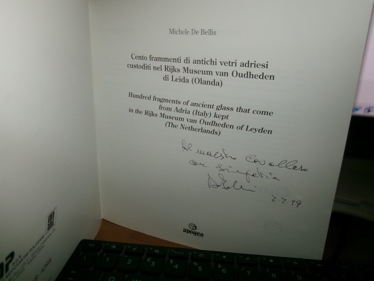 Michele DE Bellis. Cento frammenti di antichi vetri adriesi custoditi nel Rijks Museum van Oudheden di Leida (Olanda). Adria, Apogeo Editore, 1998. In-8° quadrato br. ill. a col. 124 pp. con numerose illustrazioni a colori e in bianco e nero n.t. Ottimo stato con dedica nella prima bianca e una seconda firmata dall' autore nel frontespizio con testo in italiane e inglese. Neg. mob. 17