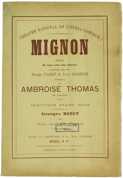 MIGNON. Opéra en trois actes, cinq tableaux. Paroled de mm. Michel Carré & Jules Barbier, musique de Ambroise Thomas de l'Institut - Partition piano solo transcrite par Georges Bizet.