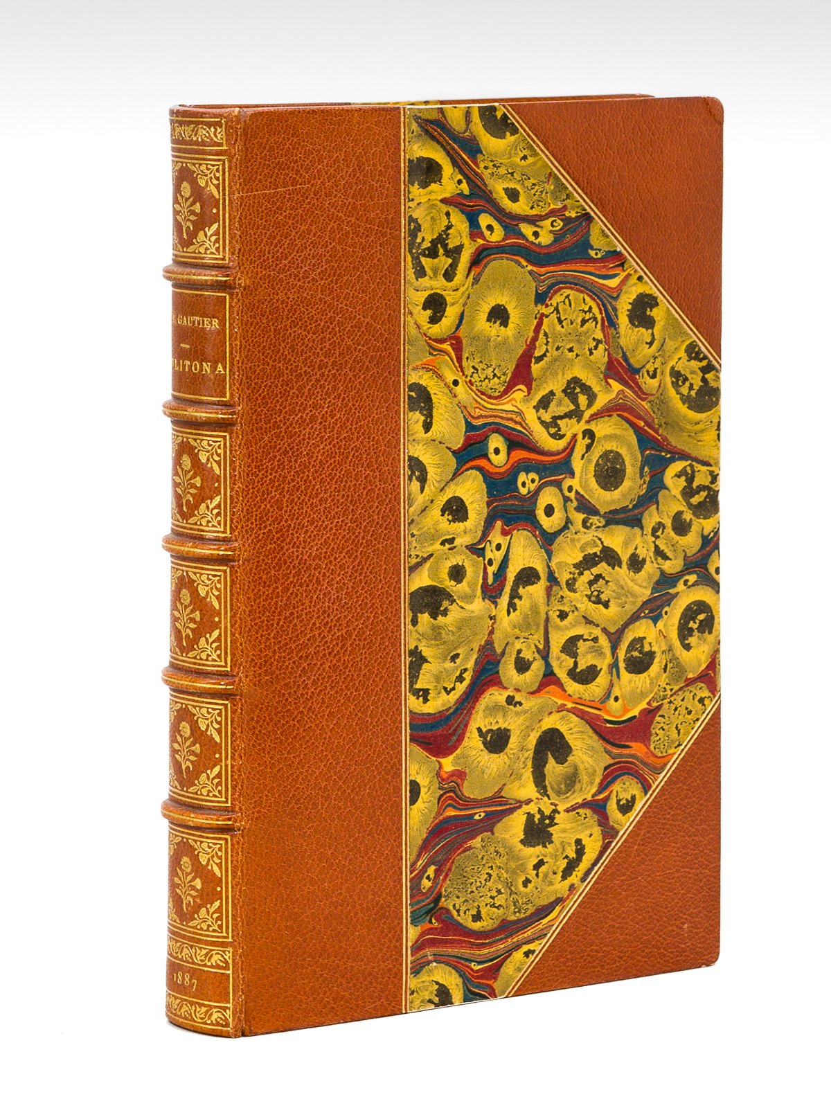 Un portrait et dix compositions de Adrien Moreau, gravés par A. Lamotte, un des 350 exemplaires sur petit papier vélin du Marais numérotés de 151 à 500 et paraphés par l'éditeur (n° 380), 1 vol. in-8 reliure demi-maroquin à coins orange, dos à 5 nerfs dorés orné, tête dorée, double filet doré en coins et mors, couvertures conservées, reliure signée de P. Ruban, Librairie L. Conquet, Paris, 1887, 2 ff., 255 pp. avec portrait en frontispice et 8 planches hors texte Superbe reliure de ce grand relieur que fut Petrus Ruban, pour ce roman espagnol et tauromachique de Théophile Gautier, évoquant l'amour d'Andrès pour Militona, la modeste ouvrière jalousement gardée par Juancho le torero. Bon exemplaire en très bon état. Vicaire, III, 904