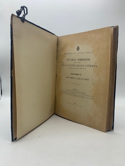 In 4 (cm 23,5 x 33), pp. 380 con tabelle nel testo da pagina 225 a 380 e con 25 tavole finali molte delle quali piu' volte ripiegate, illustrate a colori, o con grafici, numerate da 1 a 8 e poi da 1 a 17. Alone brunito lungo i bordi del frontespizio. Legatura coeva in mezza pergamena con danno riparato all'angolo superiore esterno del piatto anteriore. Il Ministro dei lavori pubblici, Lacava, con decreto del 22 marzo 1900, istitui' la commissione per lo studio della navigazione interna nella valle del Po, affidandole l'incarico di proporre i provvedimenti piu' adatti per promuovere un maggiore sviluppo della navigazione interna fra Milano e Venezia, anche con la maggiore utilizzazione dei fiumi e dei canali navigabili esistenti nella Valle Padana. La commissione pubblicava, come esito degli studi, questi atti in piu' volumi, rilevando lo stato di navigabilita' dei canali lombardo-veneti e dei fiumi, e facendo concrete proposte per il miglioramento di quei canali. Questo volume e' dedicato nello specifico al Fiume Mincio e al Lago di Garda.