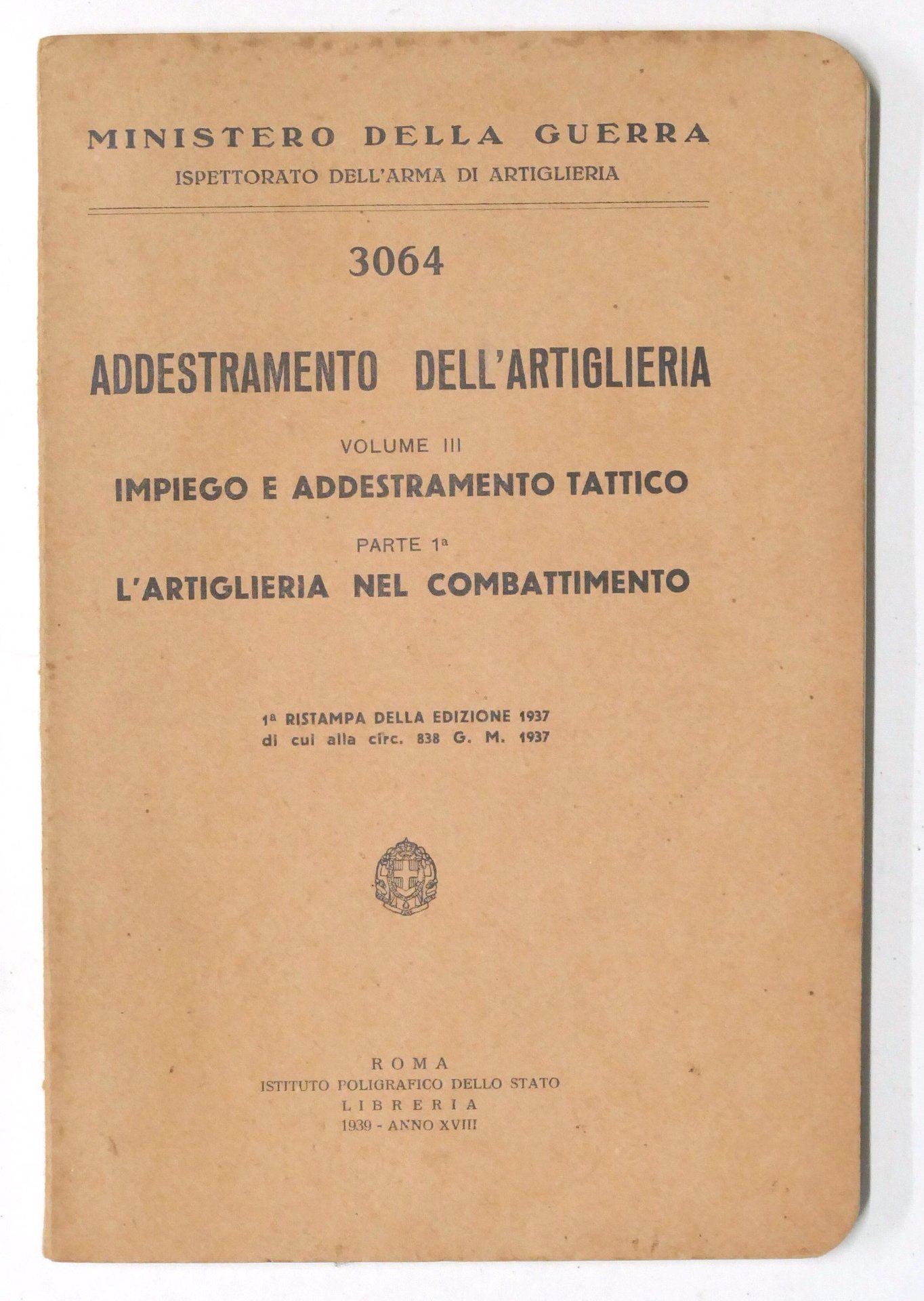 Ministero della Guerra - 3064 - Addestramento dell'Artiglieria - Vol. III impiego e addestramento tattico - parte 1^ l'artiglieria nel combattimento - ed. 1939 Pag. 123 Copertina morbida - Testo in italiano. Condizioni generali molto buone.