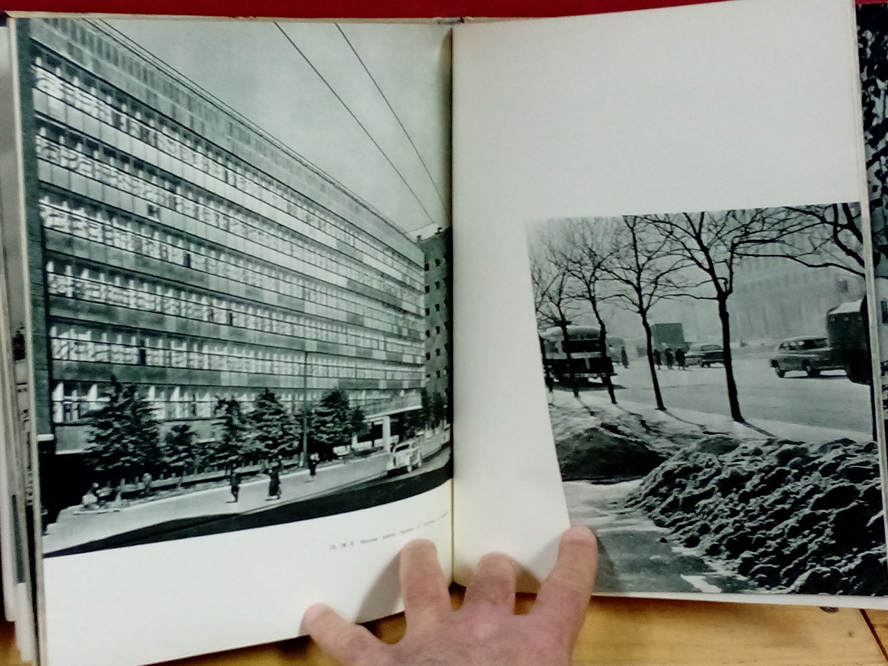 In – 4to ( misure 29x23 ), piena tela editoriale con sovraccoperta illustrata, pp. 105 circa non numerate. Libro interamente fotografico composto da 101 tavole in nero e a colori, alcune a doppia pagina. Testo in russo. Allegato al volume un fascicolo di 8 pagine con la traduzione delle didascalie delle foto in francese, inglese e tedesco. Mosca com'era negli anni '50, nel pieno della guerra fredda e del comunismo imperante. Nonostante tutto dalle belle foto di questo volume, che ritraggono strade e piazze affollate di gente, traspare un senso di benessere e tranquillita' tipico delle grandi citta' occidentali dello stesso periodo, a cominciare da quelle italiane. Tutto questo oggi è solo un ricordo, sia per loro che per noi.