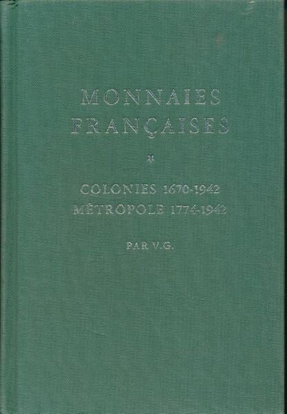 Sans nom 1970 Sans lieu ni date, vers 1970. Très fort In-12 pleine toile verte, 836 pages sur papier glacé. Réimpression de la très rare édition de 1942, référence sur le sujet. Contient la nomenclature de 5600 descriptions et indications de valeur de collection, illustrée de 3000 monnaies-types photographiées, de toutes les monnaies officielles et essais métalliques des : Colonies françaises des origines à nos jours : 1670-1942. Métropole, du Roi Louis XVI à nos jours. 1774 - 1942 y compris : Républiques, Royaumes, Souverainetés, Principautés, Sièges et occupations sous domination française. Très bon état.