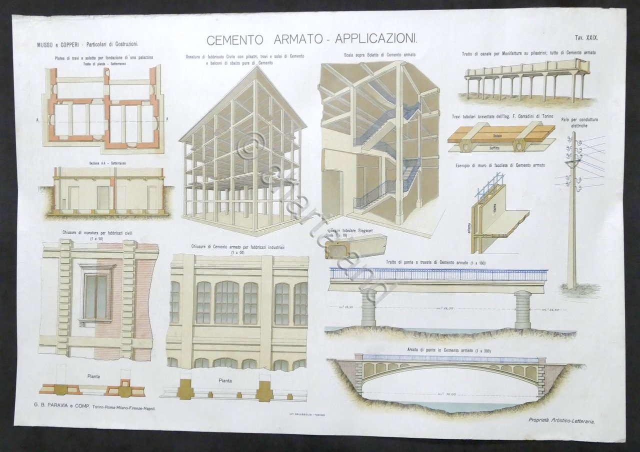 Musso e Copperi - Particolari di Costruzioni - Tavola XXIX - Cemento Armato - Applicazioni - 1900 ca. Dimensioni: 44 x 64 cm ca. Didascalie in italiano. Condizioni generali buone, come da foto.