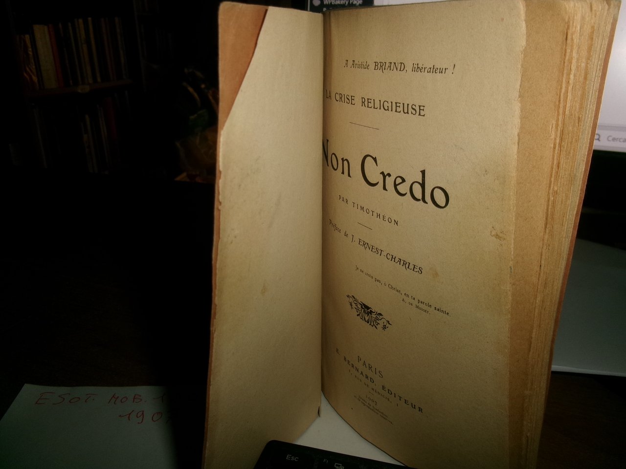 La crise religieuse. Severa critica religiosa. Par Timothèon. Prèface de J. Ernest-Charles. Je ne crois pas, ò Christ, en ta parole sainte. (A. de Musset). Paris, E. Bernard, 1907. In-16°, br., orig. 291 pp. Testo francese. Ben conservato. Neg. esot. mob. 102 in busta trasp.